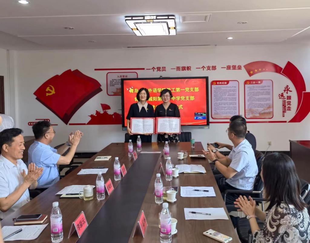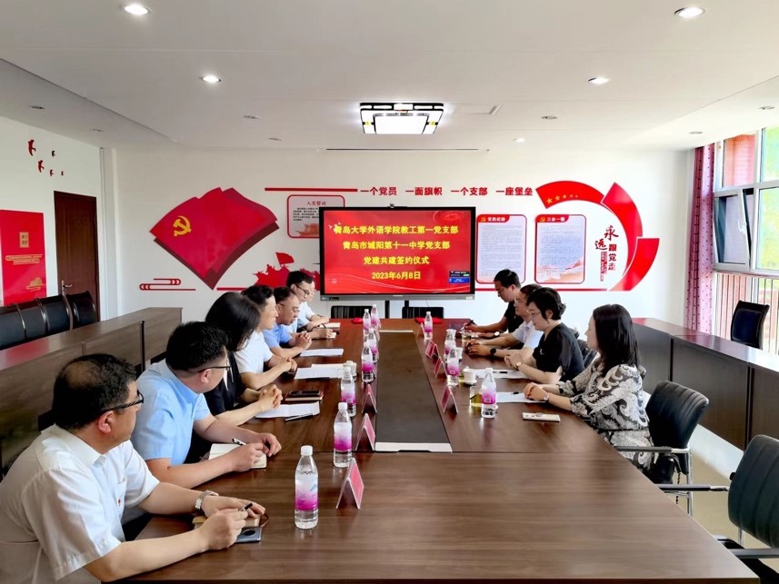 為創(chuàng)新基層黨建工作載體,提高基層黨建工作水平,推動學(xué)習(xí)貫徹習(xí)近平新時代中國特色社會主義思想主題教育走深走實,2023年6月8日上午,青島大學(xué)外語學(xué)院教工第一黨支部和青島市城陽區(qū)第十一中學(xué)黨支部舉行支部共建簽約儀式。青島大學(xué)外語學(xué)院黨委書記周偉同志,紅島教育服務(wù)中心黨總支書記紀(jì)瑞仕同志,城陽區(qū)第十一中學(xué)校長呂廷良、副校長魏奎,城陽區(qū)第十一中學(xué)黨支部書記李彩云、支部委員高振勝、郭竹紅、周春光等同志,外語學(xué)院教工第一黨支部支部書記王薇、支部黨員牛聰琳、呂凱良等同志出席活動并鑒簽。