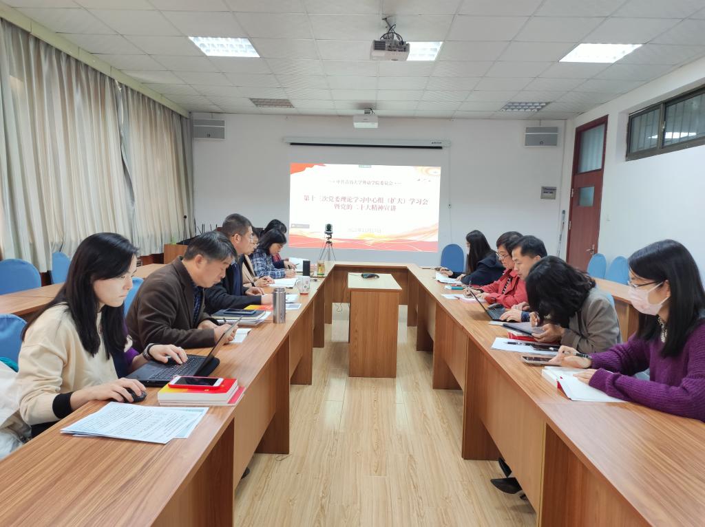 11月17日下午,外語(yǔ)學(xué)院黨委理論學(xué)習(xí)中心組(擴(kuò)大)學(xué)習(xí)會(huì)(第十三次)在浮山校區(qū)博文樓312會(huì)議室召開(kāi),學(xué)院黨委書(shū)記周偉為學(xué)院班子成員、支部書(shū)記、系辦(中心)主任、學(xué)科骨干、輔導(dǎo)員等80余名教職員工作黨的二十大精神宣講報(bào)告。報(bào)告會(huì)采取線上線下相結(jié)合的形式。班子成員、支部書(shū)記在線下參會(huì)。