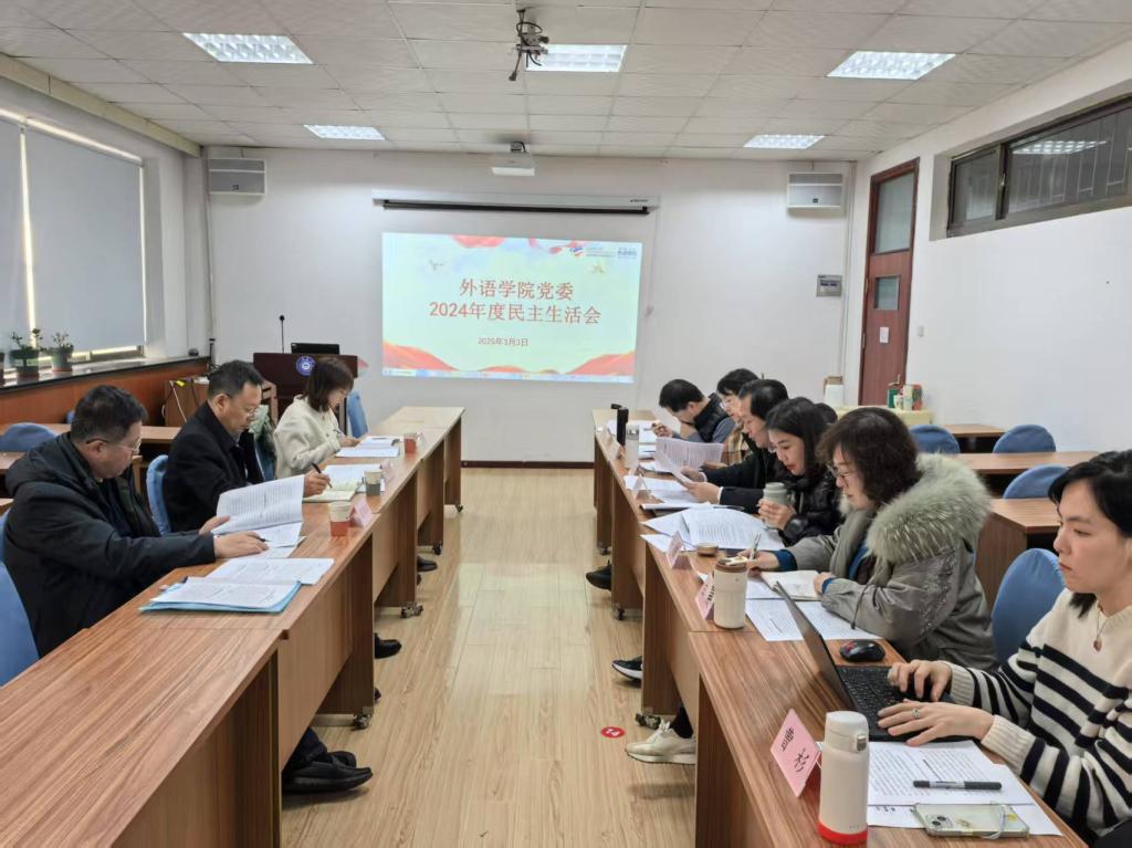 2025年2月27日下午2:30,外語學院在博文樓312召開2024年度學院民主生活會。學院黨委班子全體成員參加會議,校黨委常委、副校長劉恩賢參加并指導學院民主生活會。