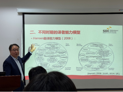 隨后,孟教授詳細(xì)闡述了不同時(shí)期的10種譯者能力模型。他剖析了各模型的獨(dú)特之處及其在當(dāng)下翻譯實(shí)踐中的運(yùn)用情況,彰顯出翻譯行業(yè)對(duì)譯者的要求日益嚴(yán)苛與多元。這不僅表明了譯者需要扎實(shí)的語言功底,更需具備跨文化交際、相關(guān)專業(yè)領(lǐng)域知識(shí)以及技術(shù)應(yīng)用等多方面的能力。此外,孟教授還具體闡釋了譯者能力模型在德國綜合性大學(xué)與應(yīng)用型大學(xué)翻譯課程設(shè)置中的不同體現(xiàn),盡管不同課程各有側(cè)重,但都共同構(gòu)建起多元化的翻譯人才培養(yǎng)體系。