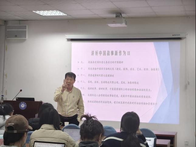 講座伊始,謝旭升教授從霍爾姆斯對(duì)翻譯學(xué)科的經(jīng)典劃分切入,并結(jié)合自己長(zhǎng)期從事跨文化交流、媒體翻譯與政治話語(yǔ)傳播的研究實(shí)踐,指出翻譯研究由“譯學(xué)理論”與“譯術(shù)應(yīng)用”共同構(gòu)成,譯學(xué)統(tǒng)攝譯術(shù),而譯術(shù)踐行譯學(xué)。在講述過(guò)程中,謝教授多次結(jié)合自身親歷的翻譯案例,語(yǔ)言詼諧、生動(dòng),現(xiàn)場(chǎng)不時(shí)響起笑聲,使嚴(yán)肅的理論問(wèn)題變得直觀、鮮活。他圍繞“講好中國(guó)故事”這一核心主題展開(kāi),梳理了其PPT中從“講好中國(guó)故事的背景、意義、戰(zhàn)略布局、中央重要指示與專家論見(jiàn),到世界話語(yǔ)體系中的中國(guó)故事內(nèi)涵”等多個(gè)板塊的內(nèi)容,系統(tǒng)呈現(xiàn)了構(gòu)建中國(guó)國(guó)際傳播話語(yǔ)體系的重要路徑。他強(qiáng)調(diào),翻譯傳播中應(yīng)堅(jiān)持“求大同,存小異”,以“歸化為主、異化為輔”的策略來(lái)實(shí)現(xiàn)有效的跨文化溝通,惟其如此,才能真正達(dá)到“潤(rùn)物細(xì)無(wú)聲”的傳播效果。