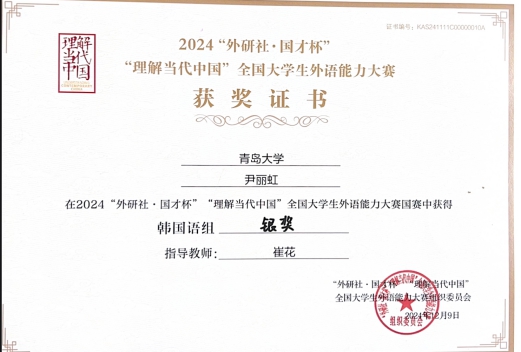 12月9日,2024“外研社·國才杯”“理解當(dāng)代中國”全國大學(xué)生外語能力大賽國賽圓滿落幕。我院2024級朝鮮語口譯尹麗虹同學(xué)榮獲全國總決賽多語種韓國語組銀獎。