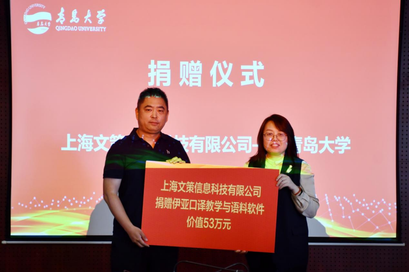 為支持青島大學(xué)和外語學(xué)院教育事業(yè)發(fā)展,四家社會企業(yè)本次向?qū)W校提供資金捐贈和實(shí)物捐贈,合計捐贈金額175.06萬元。其中,96級日語系校友劉偉、李永勝分別捐贈50萬元,設(shè)立“依美時尚教育基金”和“帝源服飾教育基金”,用于支持學(xué)院的學(xué)科建設(shè)、教師發(fā)展、人才培養(yǎng)、校園文化建設(shè)。青島智邦慧海文化傳播有限公司捐贈價值22.06萬元的智慧教室設(shè)備,上海文策信息科技有限公司捐贈價值53萬元的伊亞口譯教學(xué)與語料軟件V1.0軟件系統(tǒng),用于外語學(xué)院計算機(jī)輔助翻譯實(shí)驗室的設(shè)備更新和系統(tǒng)升級,提升學(xué)院計算機(jī)輔助翻譯教學(xué)的信息化、智能化水平,為AI賦能高水平外語語言人才成長提供平臺支撐。