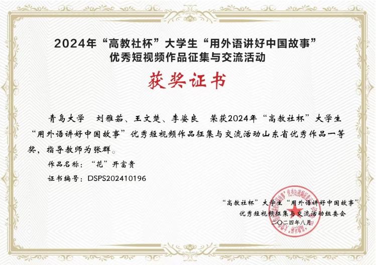 近日,由中國英漢語比較研究會主辦、南京大學(xué)、湖南大學(xué)聯(lián)合高等教育出版社共同舉辦的2024年“高教社杯”大學(xué)生“用外語講好中國故事”優(yōu)秀短視頻作品征集活動公布獲獎名單。青島大學(xué)外語學(xué)院英語系張群老師指導(dǎo)、劉雅茹、王文楚、李姿良同學(xué)的團(tuán)隊(duì)作品《“花”開富貴》脫穎而出,榮獲山東省一等獎。