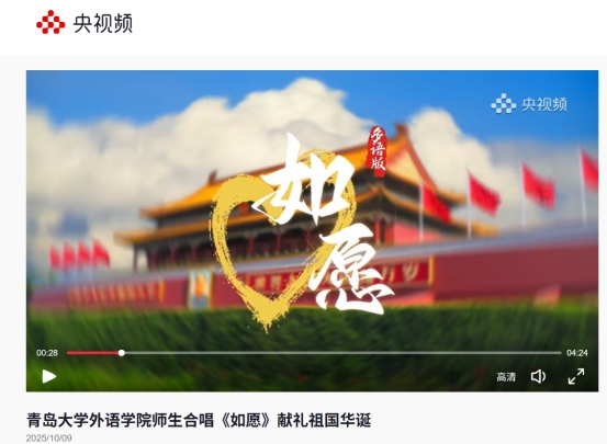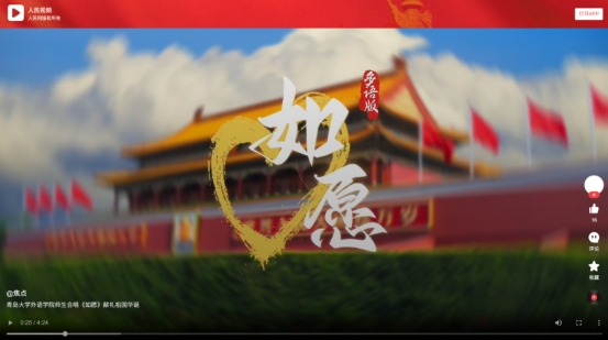 為慶祝中華人民共和國成立七十六周年,深入弘揚(yáng)愛國主義精神,厚植師生家國情懷,外語學(xué)院精心策劃并組織開展紅色歌曲《如愿》MV 拍攝活動。學(xué)院全體師生積極參與,發(fā)揮專業(yè)優(yōu)勢,以多國語言深情合唱的形式傳遞對祖國的赤誠祝福。視頻一經(jīng)發(fā)出,吸引了校內(nèi)外眾多媒體的關(guān)注,學(xué)習(xí)強(qiáng)國、人民網(wǎng)、央視頻等多家媒體相繼轉(zhuǎn)發(fā)推廣,獲得了一致好評。