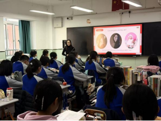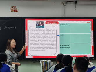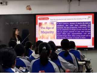 授牌儀式正式啟動前,我院趙虹、陳亦菲、羅甫梅、馬優(yōu)四位研究生同學在高二?四班開展了課堂教學實踐展示。同學們以“The Age of Majority”為題,展示了扎實的學科功底與靈活應(yīng)變的能力。課后的集體教研環(huán)節(jié),由梁永召老師主持,四位同學開展了課堂反思與感悟。高曉亮副校長、布占廷副院長、任爽老師進行了指導與點評。