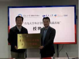 隨后,進入?yún)f(xié)議簽署與授牌環(huán)節(jié)。青島大學外語學院黨委書記陳崇研與青大附中高中校長張金堂作為雙方代表,鄭重簽署合作協(xié)議。陳崇研書記向張金堂校長頒授“青島大學外語學院實習實踐基地”牌匾。
