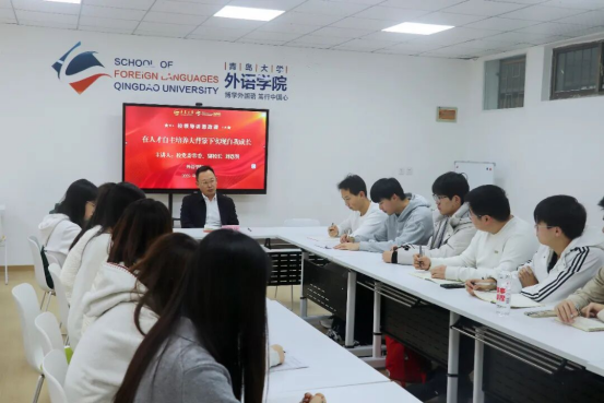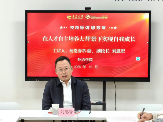 12月22日下午,青島大學(xué)黨委常委、副校長劉恩賢在博文樓204會議室,為外語學(xué)院2023級英語(語言大數(shù)據(jù))創(chuàng)新實(shí)驗班講授題為《在人才自主培養(yǎng)大背景下實(shí)現(xiàn)自我成長》的思政課,與學(xué)子們共同探討中國式現(xiàn)代化新征程中個人事業(yè)選擇與青年一代的責(zé)任擔(dān)當(dāng)。外語學(xué)院院長卞建華、黨委副書記于苗、2023級輔導(dǎo)員夏淼一同聽課,活動由卞建華主持。